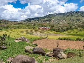 Après le petit-déjeuner, départ en direction d’Ambositra par la RN7. La route traverse les Hautes Terres centrales avec rizières en terrasses, villages en briques rouges et paysages vallonnés. En chemin, vous découvrirez le savoir-faire artisanal local et les panoramas typiques des plateaux. Le déjeuner est libre ; nous suggérons une pause à Ambatolampy où vous pourrez déjeuner dans un restaurant local (budget approximatif 4€ à 5€ par personne) et visiter un atelier de fonderie de marmites si vous le souhaitez. En fin d’après-midi arrivée à Ambositra, installation à la Vala Guest House pour le dîner et la nuit en demi-pension.